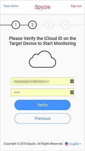 Se selecionou iOS como a plataforma do dispositivo alvo, então obterá o seguinte ecrã. Aqui, precisa de iniciar sessão na mesma conta iCloud que está ligada ao dispositivo-alvo. Certifique-se de que introduz as credenciais corretas e introduza o código único para autenticação (se necessário).