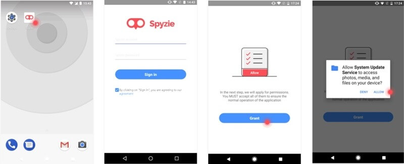 Uma vez instalada a aplicação espiã Spyzie, basta lançá-la e iniciar sessão na sua conta Spyzie. Além disso, precisa de conceder à aplicação todas as permissões necessárias para localizar o dispositivo remotamente.
