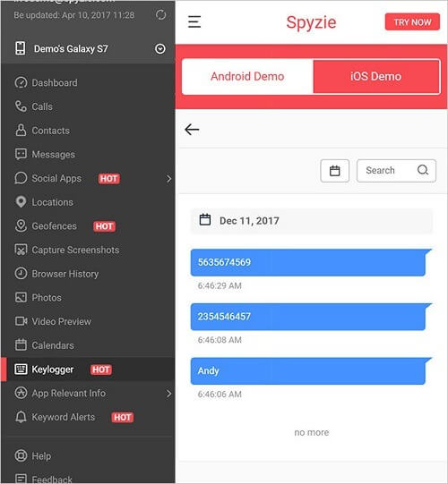 O Spyzie vem com um keylogger incorporado que manteria um registo de cada toque de tecla que é digitado no dispositivo. Isto significa que pode aceder aos seus detalhes de conta, senhas, histórico de navegação, e até mensagens apagadas.