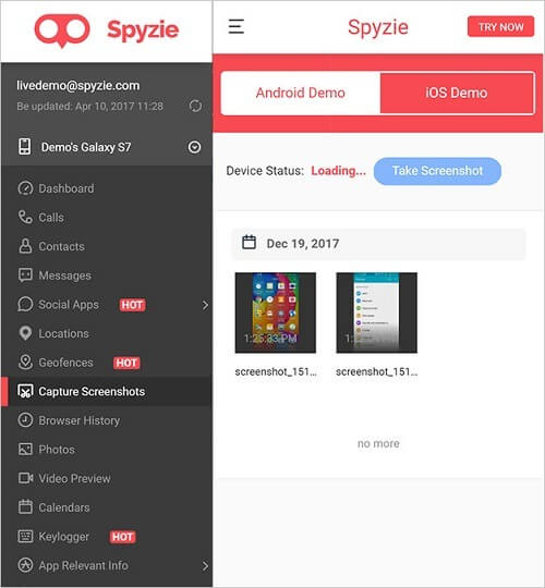 Uma das caraterísticas mais avançadas deste aplicativo de spyware tem de ser a sua opção de captura de ecrã remota. Ou seja, pode simplesmente ir ao seu painel de instrumentos Spyzie e tirar remotamente a imagem do ecrã do dispositivo ligado, sem deixar o outro utilizador saber.
