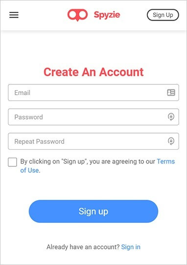 Para começar, basta ir ao site oficial do Spyzie e criar a sua conta, introduzindo uma identificação de e-mail válida. Inscreva-se e crie uma senha segura para prosseguir (e obtenha uma subscrição ativa).